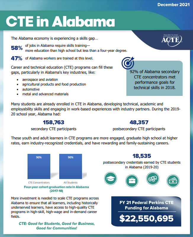 Career and Technical Education (CTE) is important year-round however added emphasis is placed on CTE in February. CTE provides students of all ages with the academic and technical skills, knowledge and training necessary to succeed in future careers and to become lifelong learners. In total, about 12.5 million high school and college students are enrolled in CTE across the nation. CTE prepares these learners for the world of work by introducing them to workplace competencies, and makes academic content accessible to students by providing it in a hands-on context. In fact, the high school graduation rate for CTE concentrators is about 90 percent – approximately 10 – 15 percentage points higher than the national average.